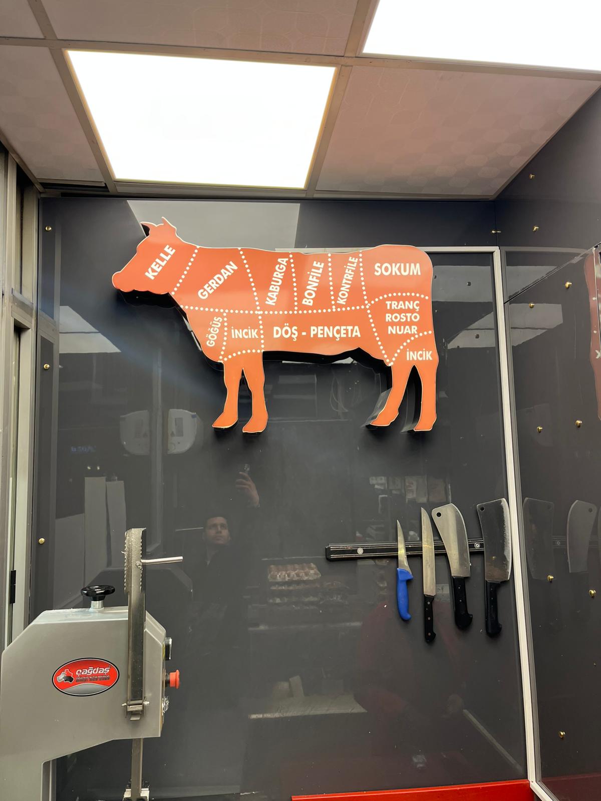 İşletme içerisinde de görsel bütünlüğü devam ettirmek adına reyon önlerine aynalı dekota kesim ışıksız uygulamalar yapılmıştır. Mağaza iç mekânında dikkat çeken en önemli detaylar ise, kasap konseptine uygun olarak tasarlanan ışıklı kutu harf tekniğiyle üretilmiş dana ve boğa figürleridir. Bu dekoratif ışıklı görseller, dükkân içi atmosfere profesyonel ve modern bir dokunuş katmaktadır. CoolSign Reklam olarak, gıda sektörü temsilcileri için hem dış cephede hem de iç mekânda müşteri deneyimini artıran özel reklam çözümleri sunmaya devam ediyoruz.