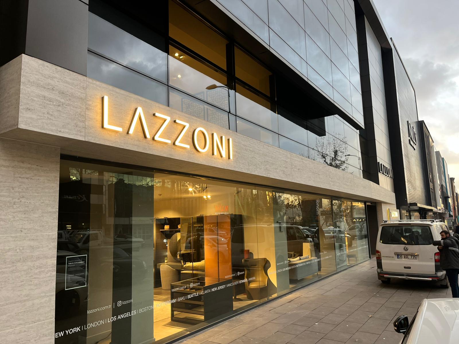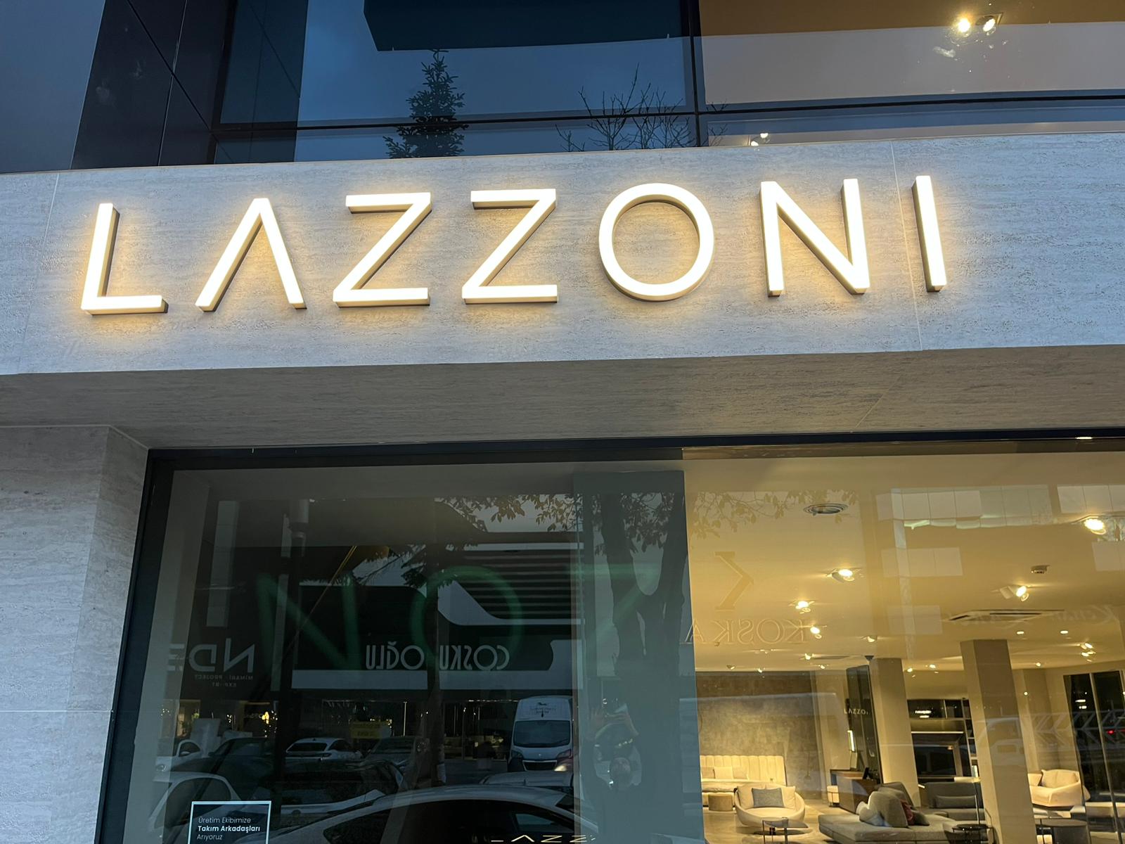 Lazzoni’nin marka prestijini ve modern çizgisini dış cepheye taşımak amacıyla gerçekleştirdiğimiz bu projede, malzeme kalitesini ve işçiliği ön planda tuttuk.