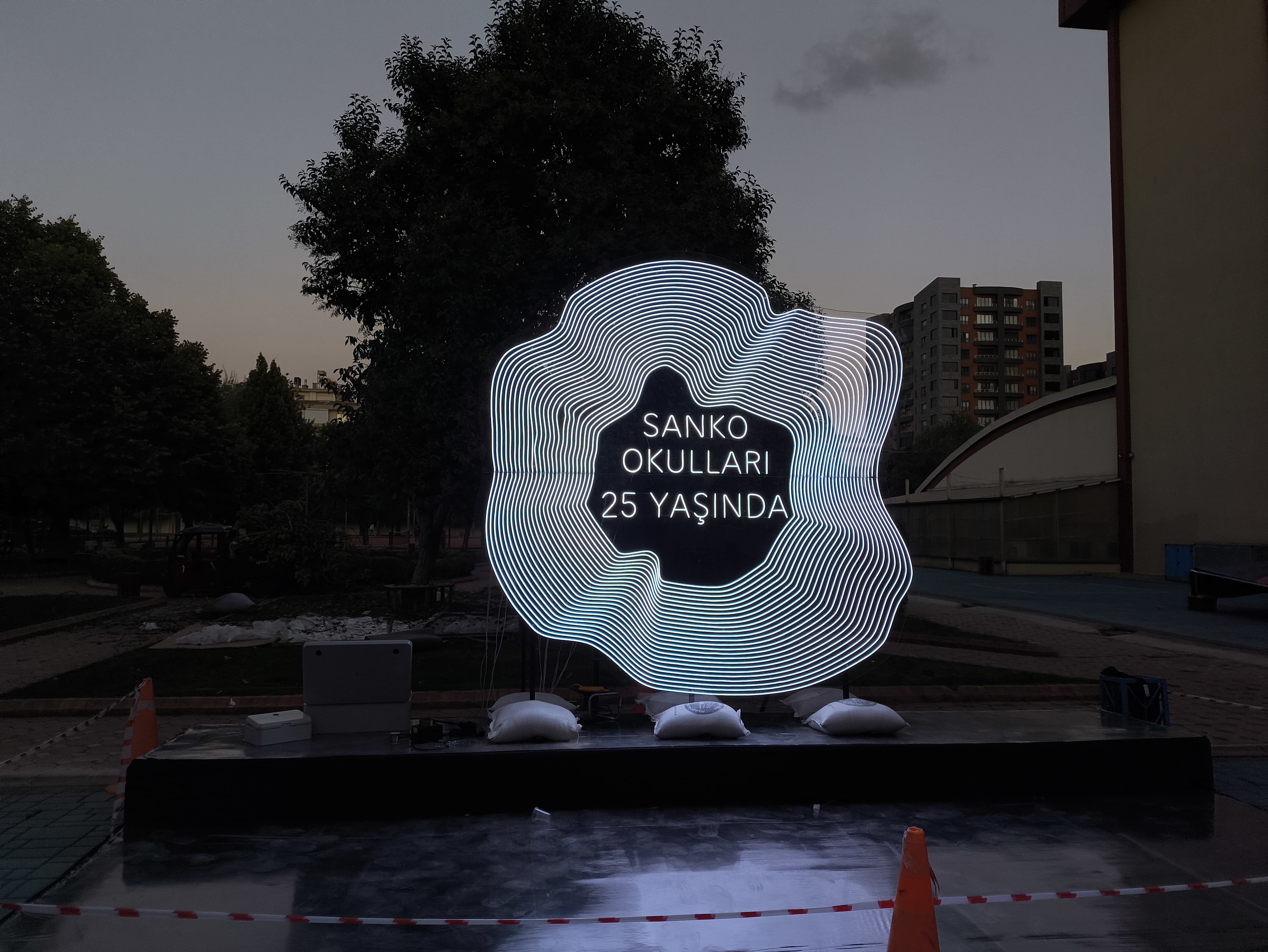 Eğitimdeki köklü geçmişi simgeleyen 25 yıllık başarıyı vurgulamak adına, görselde tam 25 sıralı neon LED döşemesi yapılmıştır. Ayaklı ve taşınabilir şekilde üretilen tabelanın arka kısmında, rüzgar ve sarsıntıya karşı dayanıklılık sağlayan özel destekli profil karkas sistem kullanılmıştır. Tasarımdan montaja kadar titiz bir işçilikle hazırlanan bu özel tasarım, Sanko Okulları'nın prestijine uygun bir estetik sunmaktadır.
